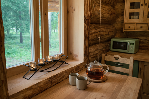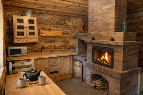 В доме есть необходимая посуда, чайник, холодильник, микроволновая печь, индукционная плита и столовые приборы, постельное белье и полотенца. Уютная студия с камином и обеденной зоной. С террасы дома открывается прекрасный вид.